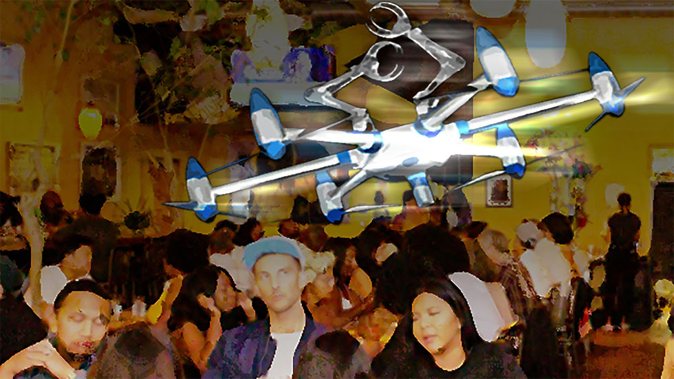 Vi blir stille. Kommer den jævlige roboten til bordet vårt? Nei. Den går mot toalettene, stopper ved to ungdommer som har t-skjorter med slagord. Så blir vi oppmerksom på en drone. Den seiler bort til bordet vårt, griper taklampa over oss og blir hengende.